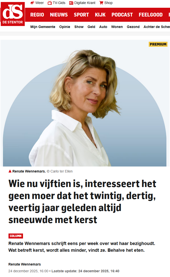 Met deze kop trok de column van Renate Wennemars mijn aandacht, met name omdat ik vanuit mijn eigen herinnering dacht dat een “witte Kerst” vroeger, twintig, dertig, veertig jaar geleden, een nogal zeldzaam en bijzonder verschijnsel was. En dat de “witte Kerst” met name een illusie is die in het leven was geroepen door Hollywood en Hallmark met hun films en kaarten met steevast witte Kerst.